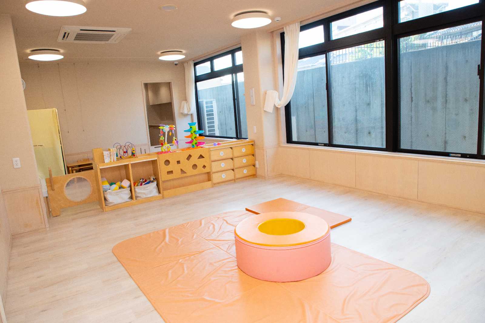 緑に囲まれた園庭を、いつでも眺められる保育室
